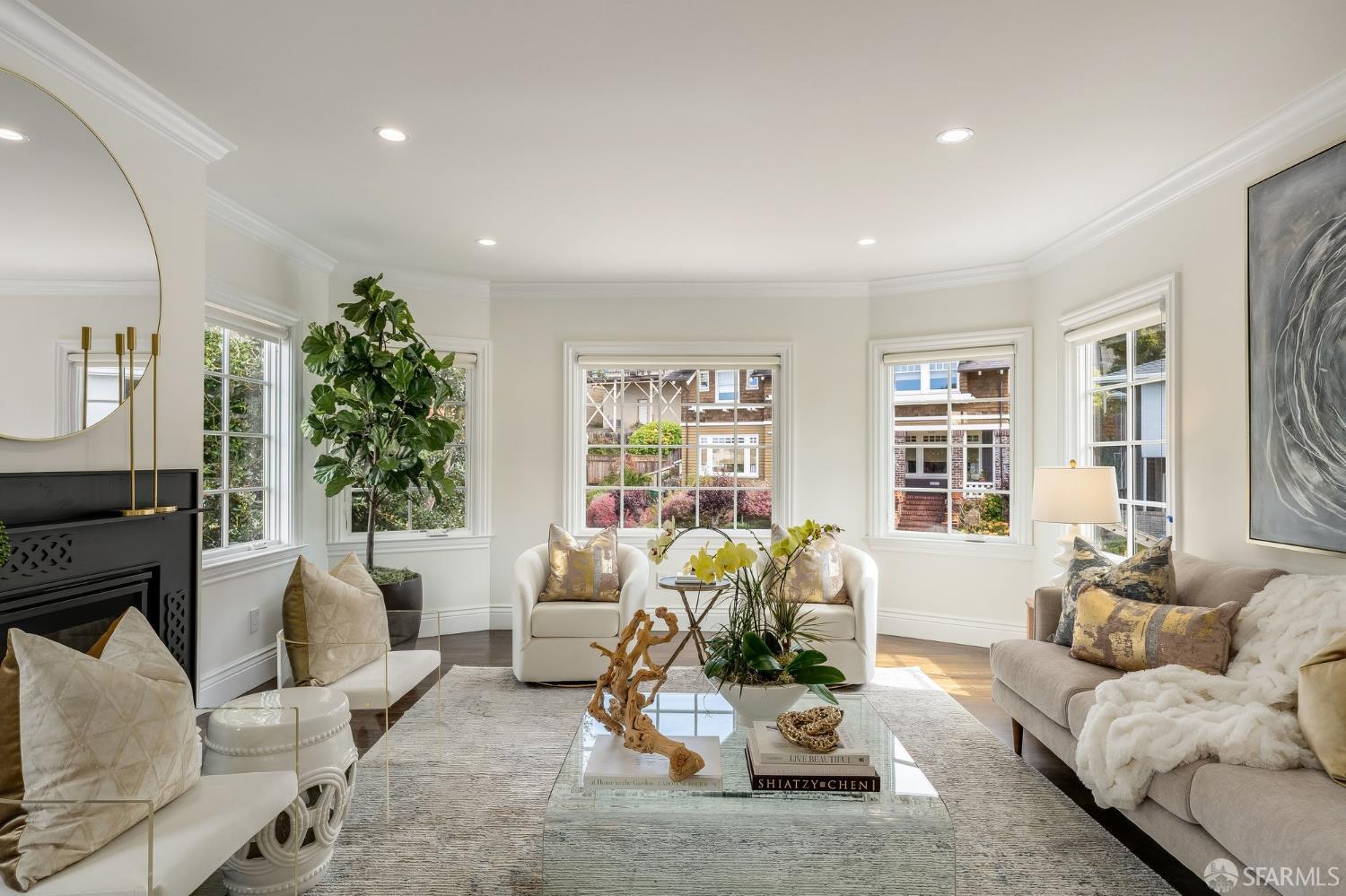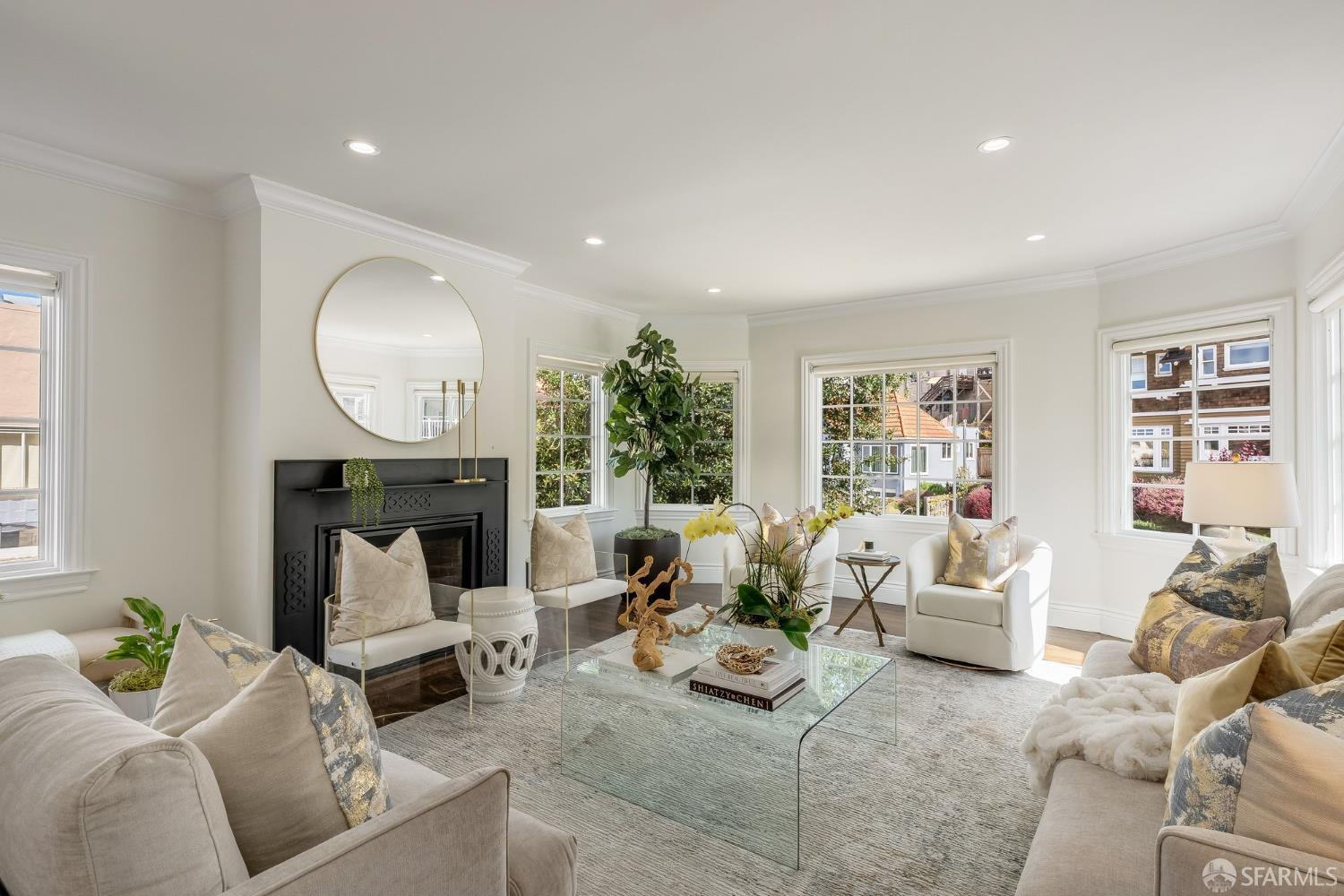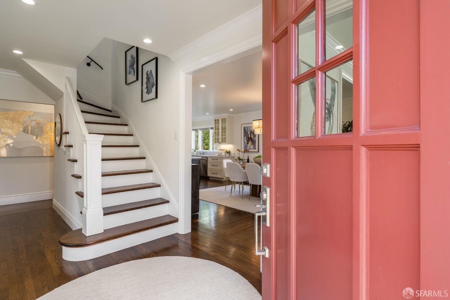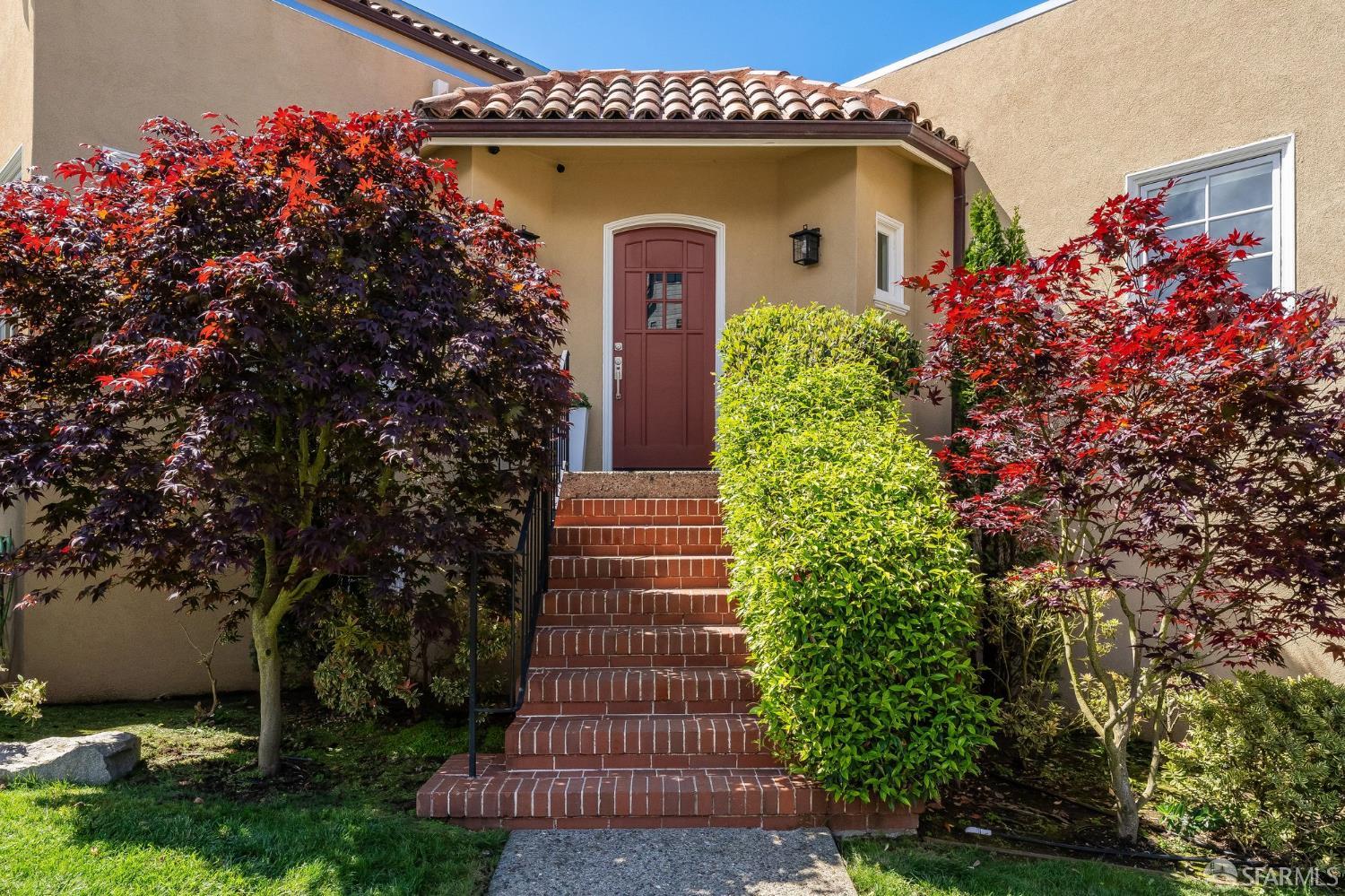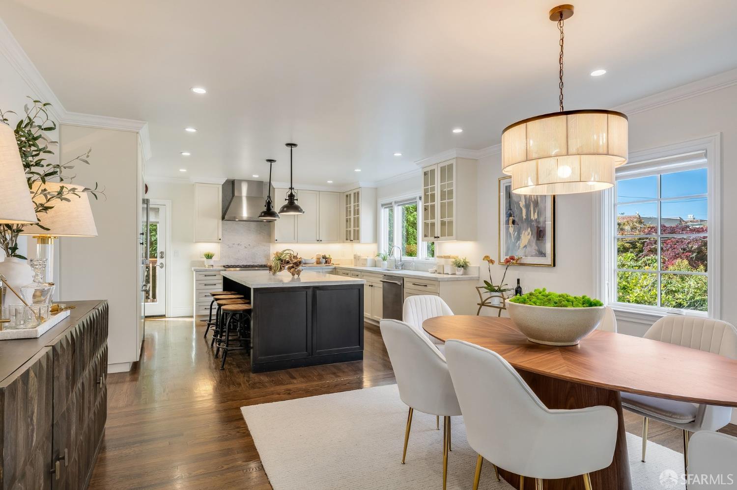 Located on a picturesque street, this beautifully remodeled and generously scaled five-bedroom, four-bath residence, with a family room and separate office, offers a flexible floor plan and timeless appeal in the sought-after Ingleside Terraces neighborhood. A formal entry sets the tone, leading to a spacious, light-filled living room with a custom gas fireplace and an abundance of windows. Adjacent is a large and inviting dining room. Seamlessly connected, the remodeled kitchen serves as a true centerpiece, showcasing Italian imported Carrara marble countertops, a large center island, and stainless steel appliances, with direct access to a deck, perfect for indoor-outdoor living and gatherings. The main level includes two well-proportioned bedrooms, including a generous primary suite, a full bath, an office or study, and laundry. Upstairs, two additional bedrooms and a full bath provide excellent privacy. The lower level features a very large family room with direct access to a lovely and spacious backyard patio, along with an additional bedroom, full bath, and ample storage. This level also offers direct access to the one-car garage, plus two-car side-by-side parking in the driveway. Throughout most of the home, hardwood floors are complemented by custom tile work in the bathrooms and lower level. Custom window coverings from The Shade Store and radiant heating throughout enhance comfort. The home's attractive curb appeal and mature landscaping, thoughtful layout, and high-quality remodel offer a rare combination of style, functionality, and warmth in one of San Francisco's most desirable neighborhoods. Minutes from transportation, Stonestown Galleria, shops and restaurants of West Portal.