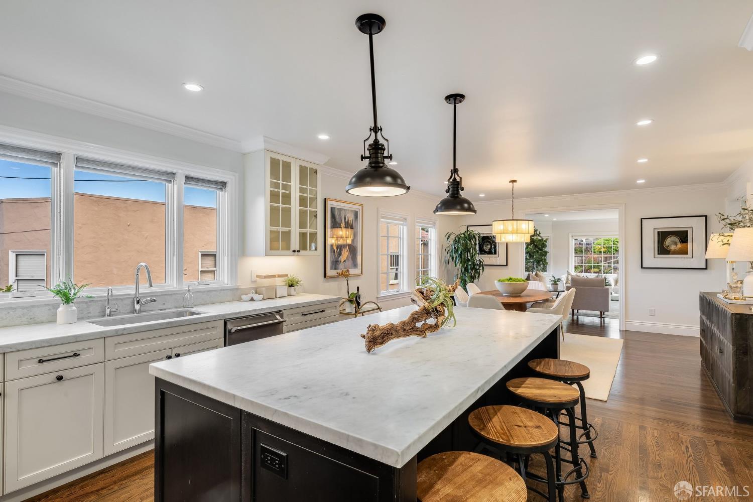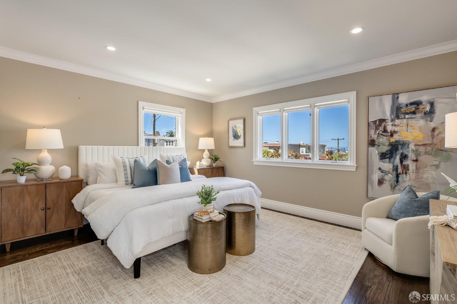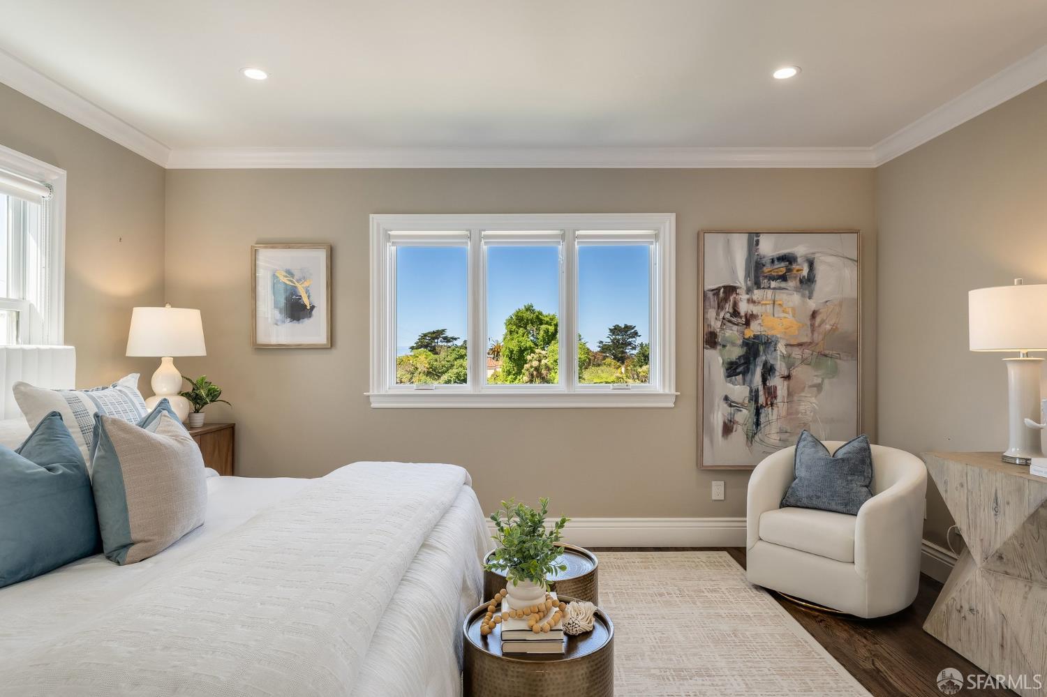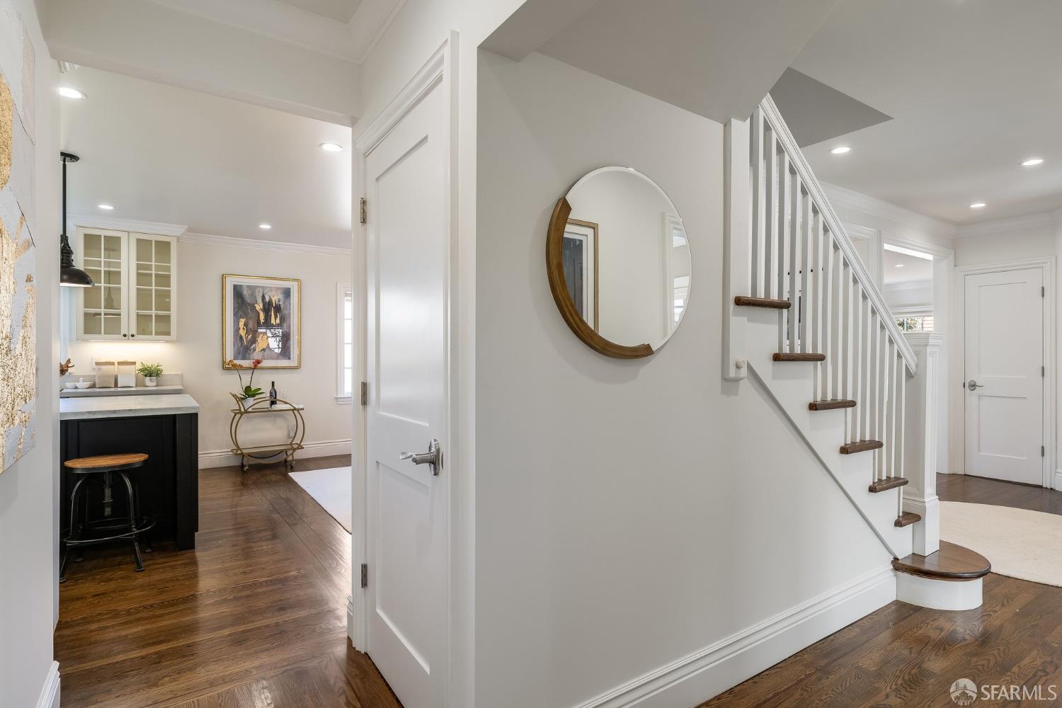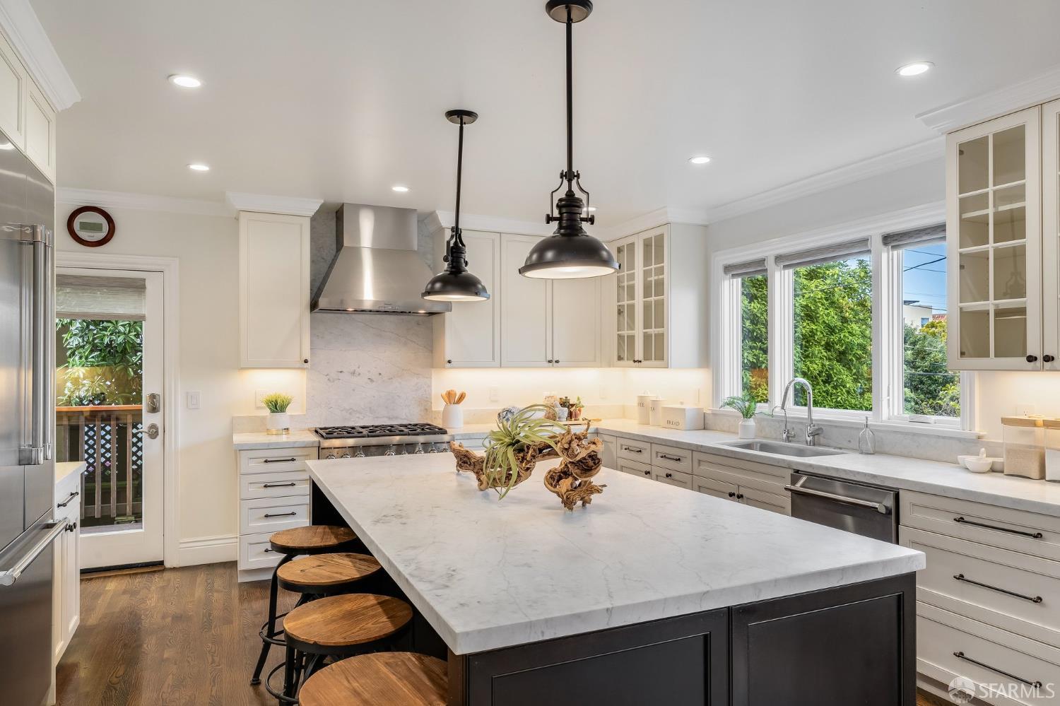 Located on a picturesque street, this beautifully remodeled and generously scaled five-bedroom, four-bath residence, with a family room and separate office, offers a flexible floor plan and timeless appeal in the sought-after Ingleside Terraces neighborhood. A formal entry sets the tone, leading to a spacious, light-filled living room with a custom gas fireplace and an abundance of windows. Adjacent is a large and inviting dining room. Seamlessly connected, the remodeled kitchen serves as a true centerpiece, showcasing Italian imported Carrara marble countertops, a large center island, and stainless steel appliances, with direct access to a deck, perfect for indoor-outdoor living and gatherings. The main level includes two well-proportioned bedrooms, including a generous primary suite, a full bath, an office or study, and laundry. Upstairs, two additional bedrooms and a full bath provide excellent privacy. The lower level features a very large family room with direct access to a lovely and spacious backyard patio, along with an additional bedroom, full bath, and ample storage. This level also offers direct access to the one-car garage, plus two-car side-by-side parking in the driveway. Throughout most of the home, hardwood floors are complemented by custom tile work in the bathrooms and lower level. Custom window coverings from The Shade Store and radiant heating throughout enhance comfort. The home's attractive curb appeal and mature landscaping, thoughtful layout, and high-quality remodel offer a rare combination of style, functionality, and warmth in one of San Francisco's most desirable neighborhoods. Minutes from transportation, Stonestown Galleria, shops and restaurants of West Portal.