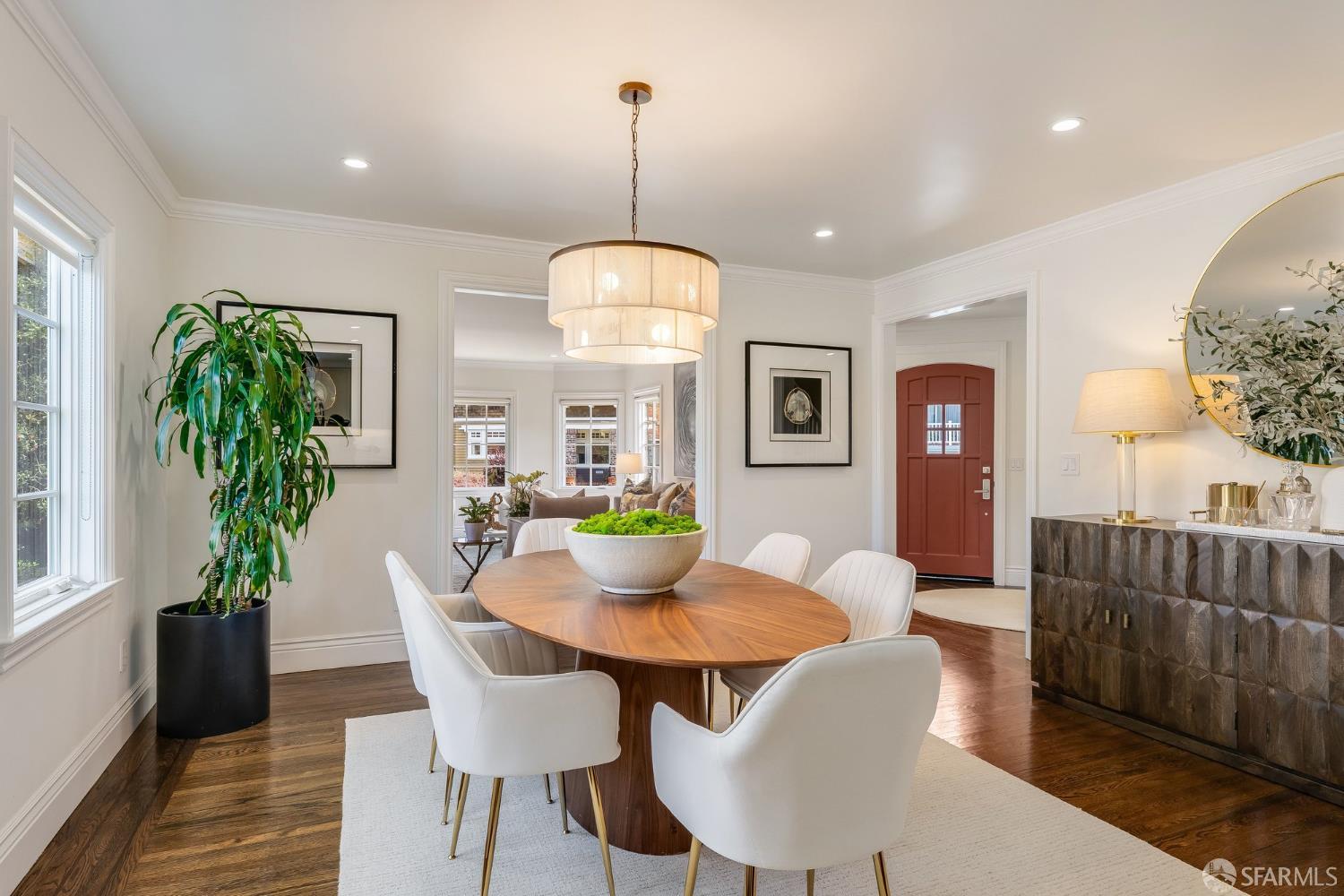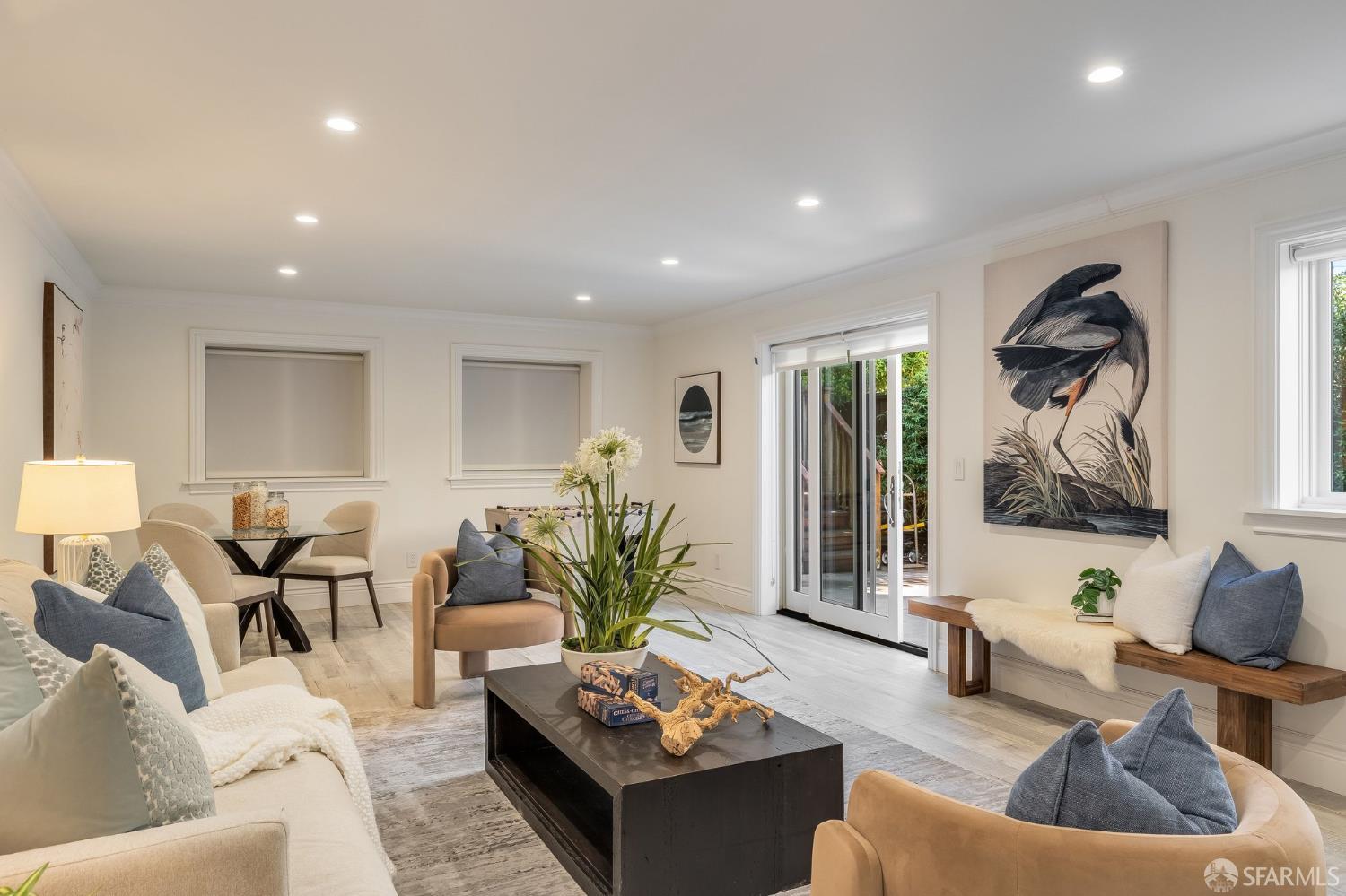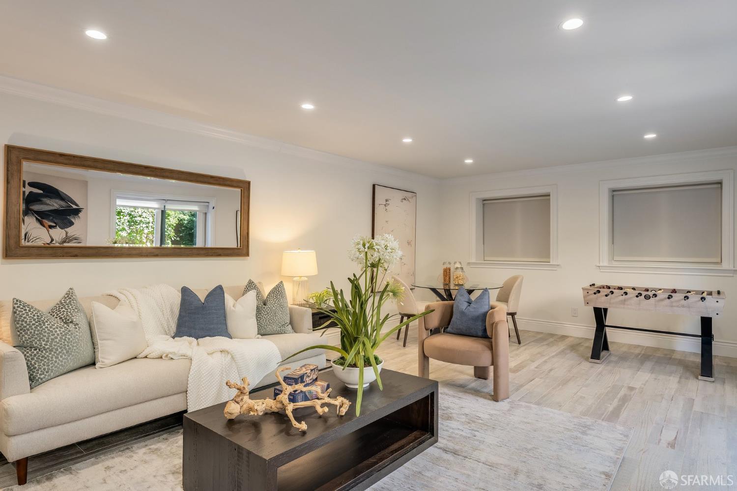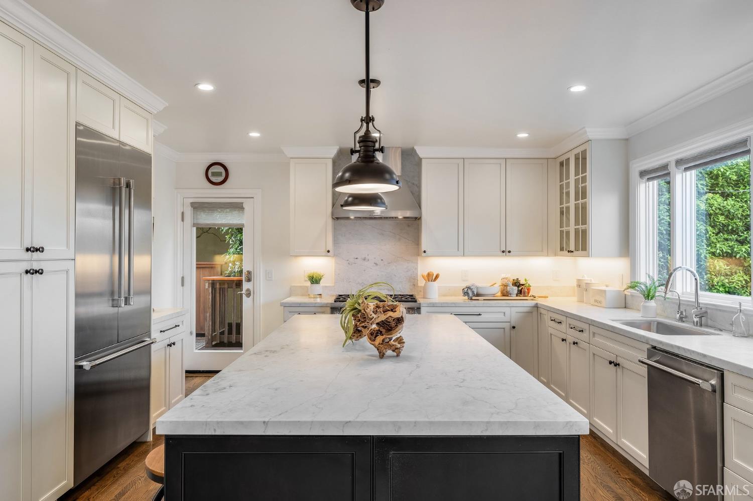 Located on a picturesque street, this beautifully remodeled and generously scaled five-bedroom, four-bath residence, with a family room and separate office, offers a flexible floor plan and timeless appeal in the sought-after Ingleside Terraces neighborhood. A formal entry sets the tone, leading to a spacious, light-filled living room with a custom gas fireplace and an abundance of windows. Adjacent is a large and inviting dining room. Seamlessly connected, the remodeled kitchen serves as a true centerpiece, showcasing Italian imported Carrara marble countertops, a large center island, and stainless steel appliances, with direct access to a deck, perfect for indoor-outdoor living and gatherings. The main level includes two well-proportioned bedrooms, including a generous primary suite, a full bath, an office or study, and laundry. Upstairs, two additional bedrooms and a full bath provide excellent privacy. The lower level features a very large family room with direct access to a lovely and spacious backyard patio, along with an additional bedroom, full bath, and ample storage. This level also offers direct access to the one-car garage, plus two-car side-by-side parking in the driveway. Throughout most of the home, hardwood floors are complemented by custom tile work in the bathrooms and lower level. Custom window coverings from The Shade Store and radiant heating throughout enhance comfort. The home's attractive curb appeal and mature landscaping, thoughtful layout, and high-quality remodel offer a rare combination of style, functionality, and warmth in one of San Francisco's most desirable neighborhoods. Minutes from transportation, Stonestown Galleria, shops and restaurants of West Portal.