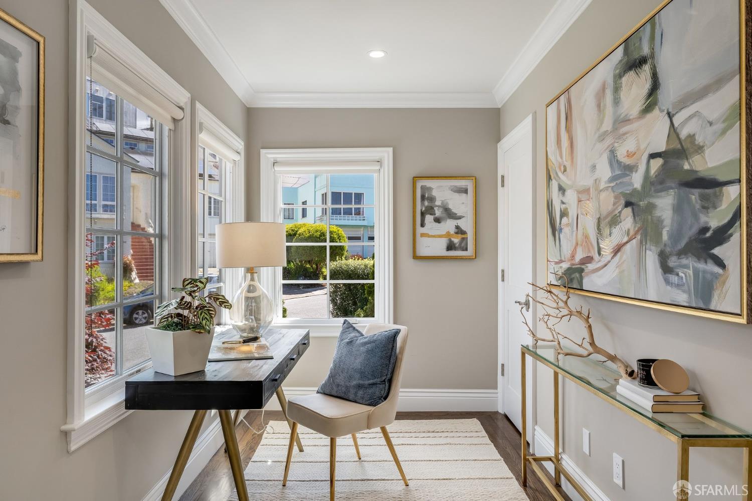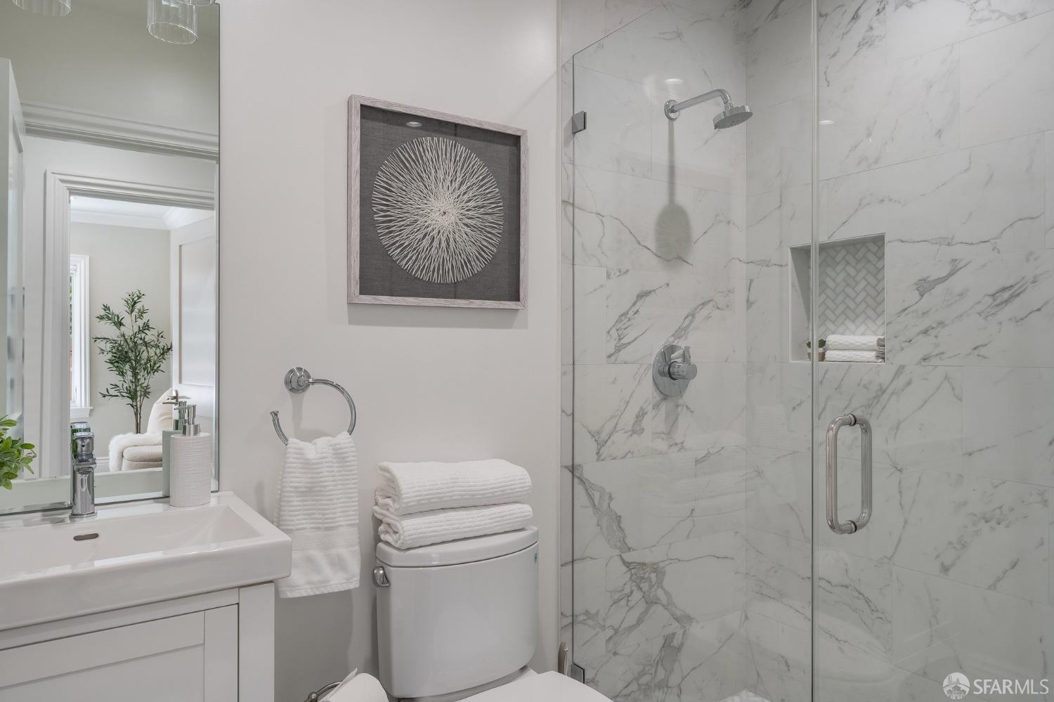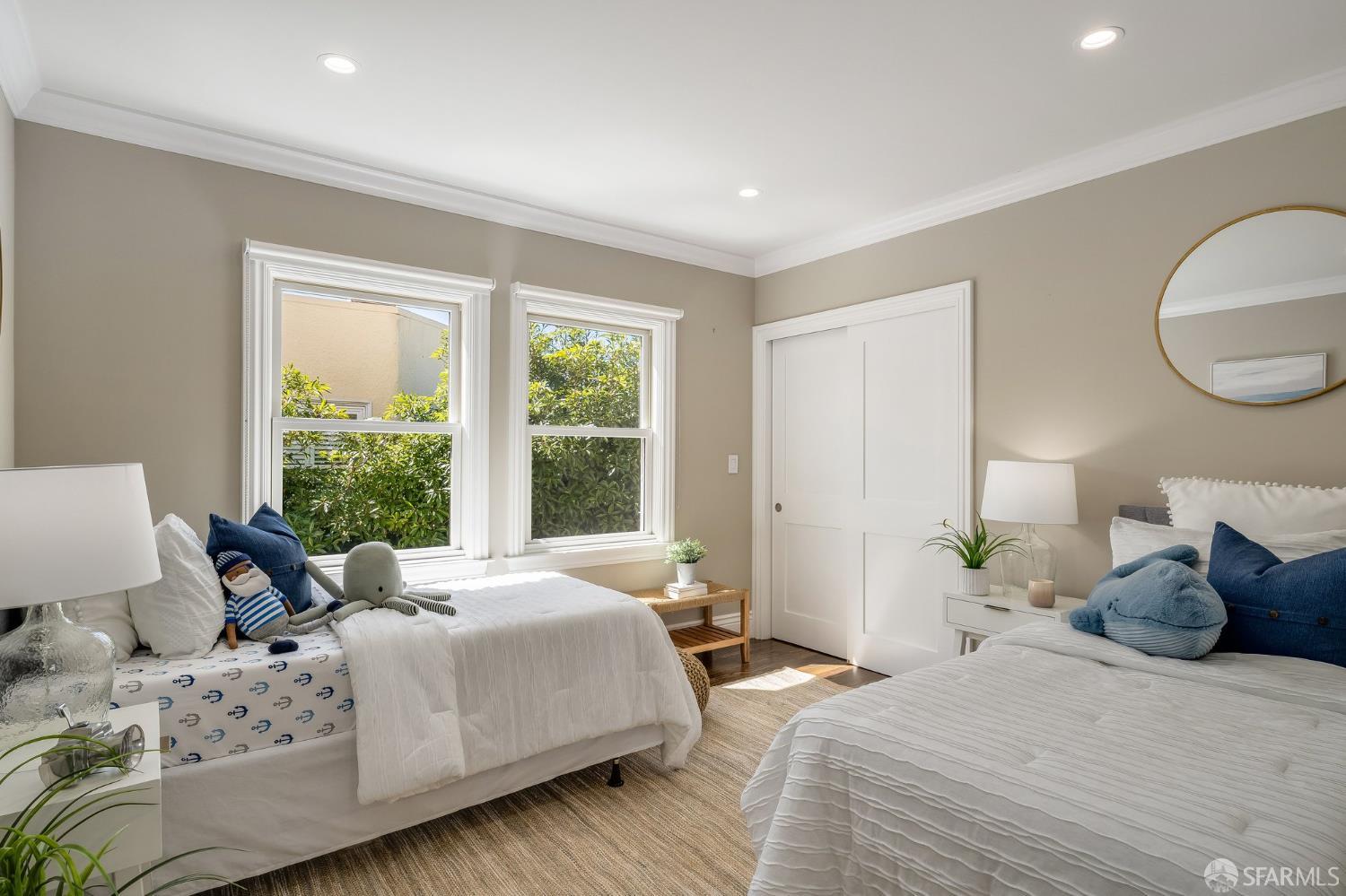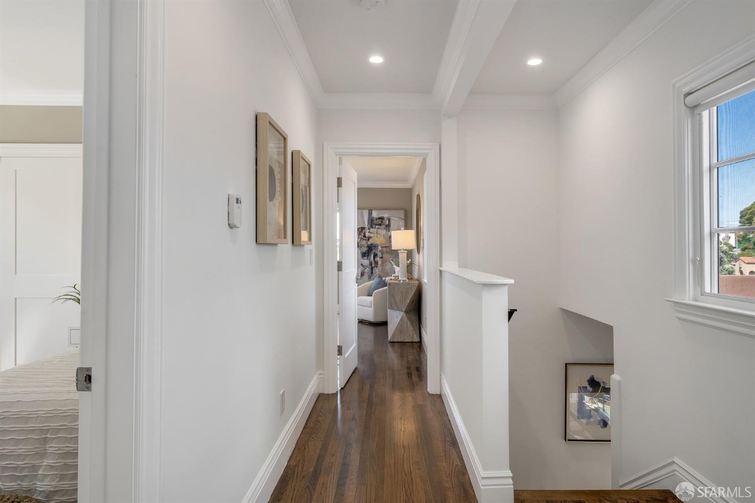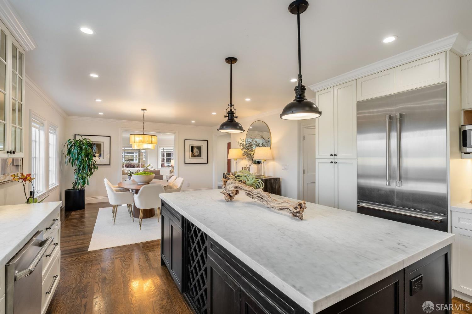 Located on a picturesque street, this beautifully remodeled and generously scaled five-bedroom, four-bath residence, with a family room and separate office, offers a flexible floor plan and timeless appeal in the sought-after Ingleside Terraces neighborhood. A formal entry sets the tone, leading to a spacious, light-filled living room with a custom gas fireplace and an abundance of windows. Adjacent is a large and inviting dining room. Seamlessly connected, the remodeled kitchen serves as a true centerpiece, showcasing Italian imported Carrara marble countertops, a large center island, and stainless steel appliances, with direct access to a deck, perfect for indoor-outdoor living and gatherings. The main level includes two well-proportioned bedrooms, including a generous primary suite, a full bath, an office or study, and laundry. Upstairs, two additional bedrooms and a full bath provide excellent privacy. The lower level features a very large family room with direct access to a lovely and spacious backyard patio, along with an additional bedroom, full bath, and ample storage. This level also offers direct access to the one-car garage, plus two-car side-by-side parking in the driveway. Throughout most of the home, hardwood floors are complemented by custom tile work in the bathrooms and lower level. Custom window coverings from The Shade Store and radiant heating throughout enhance comfort. The home's attractive curb appeal and mature landscaping, thoughtful layout, and high-quality remodel offer a rare combination of style, functionality, and warmth in one of San Francisco's most desirable neighborhoods. Minutes from transportation, Stonestown Galleria, shops and restaurants of West Portal.