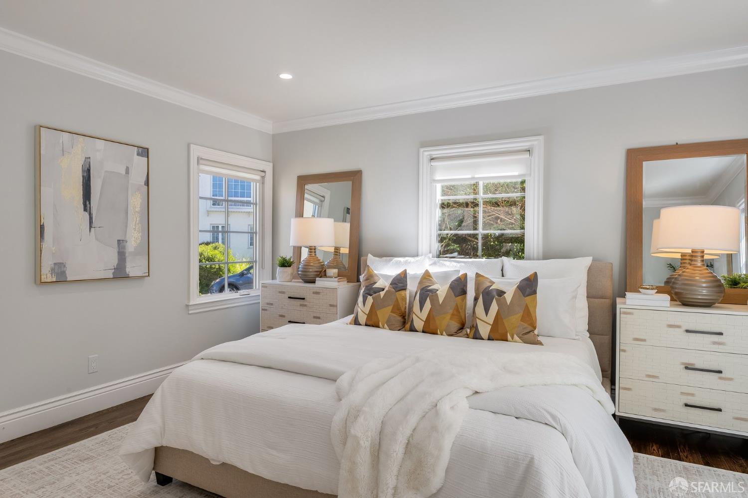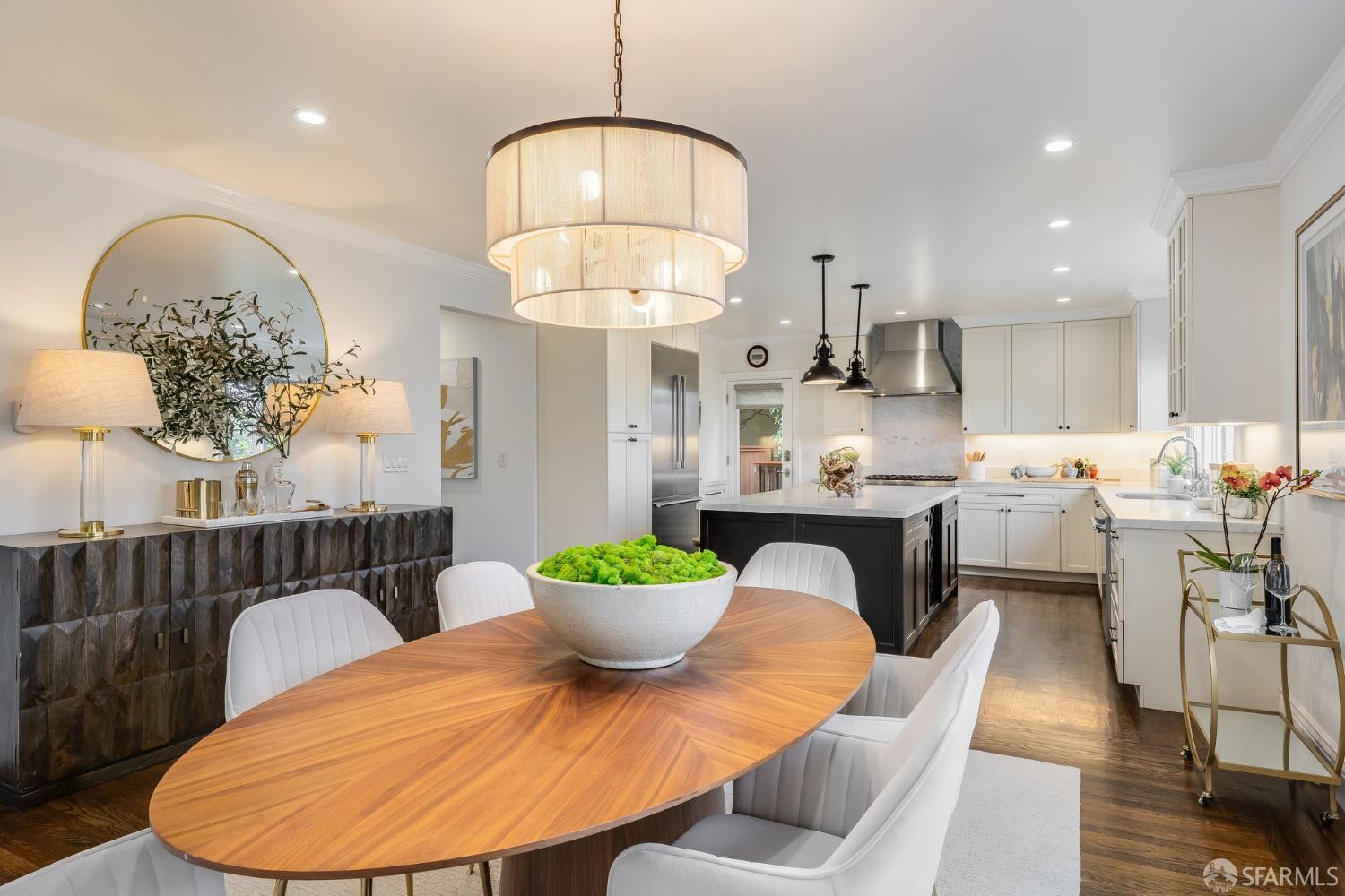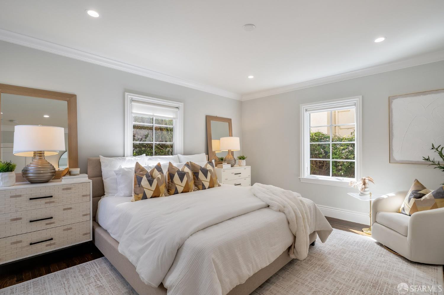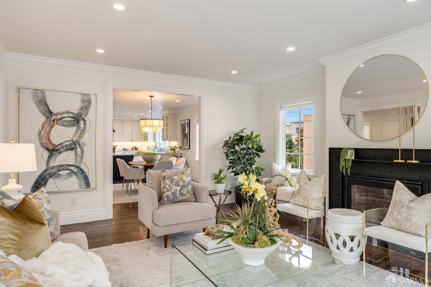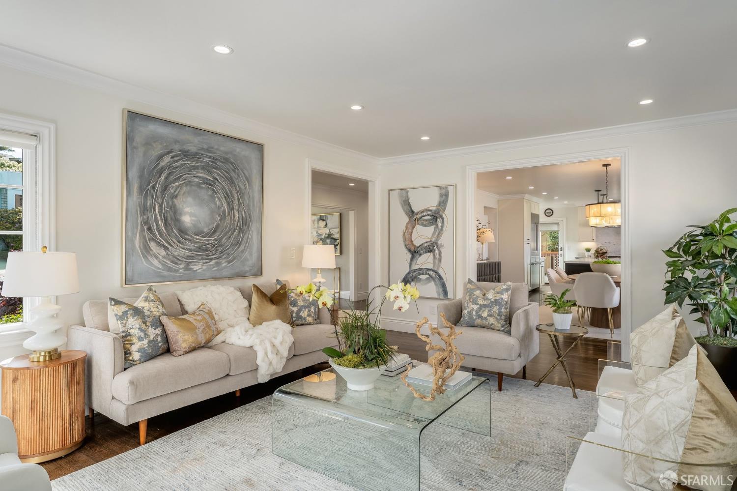 Located on a picturesque street, this beautifully remodeled and generously scaled five-bedroom, four-bath residence, with a family room and separate office, offers a flexible floor plan and timeless appeal in the sought-after Ingleside Terraces neighborhood. A formal entry sets the tone, leading to a spacious, light-filled living room with a custom gas fireplace and an abundance of windows. Adjacent is a large and inviting dining room. Seamlessly connected, the remodeled kitchen serves as a true centerpiece, showcasing Italian imported Carrara marble countertops, a large center island, and stainless steel appliances, with direct access to a deck, perfect for indoor-outdoor living and gatherings. The main level includes two well-proportioned bedrooms, including a generous primary suite, a full bath, an office or study, and laundry. Upstairs, two additional bedrooms and a full bath provide excellent privacy. The lower level features a very large family room with direct access to a lovely and spacious backyard patio, along with an additional bedroom, full bath, and ample storage. This level also offers direct access to the one-car garage, plus two-car side-by-side parking in the driveway. Throughout most of the home, hardwood floors are complemented by custom tile work in the bathrooms and lower level. Custom window coverings from The Shade Store and radiant heating throughout enhance comfort. The home's attractive curb appeal and mature landscaping, thoughtful layout, and high-quality remodel offer a rare combination of style, functionality, and warmth in one of San Francisco's most desirable neighborhoods. Minutes from transportation, Stonestown Galleria, shops and restaurants of West Portal.