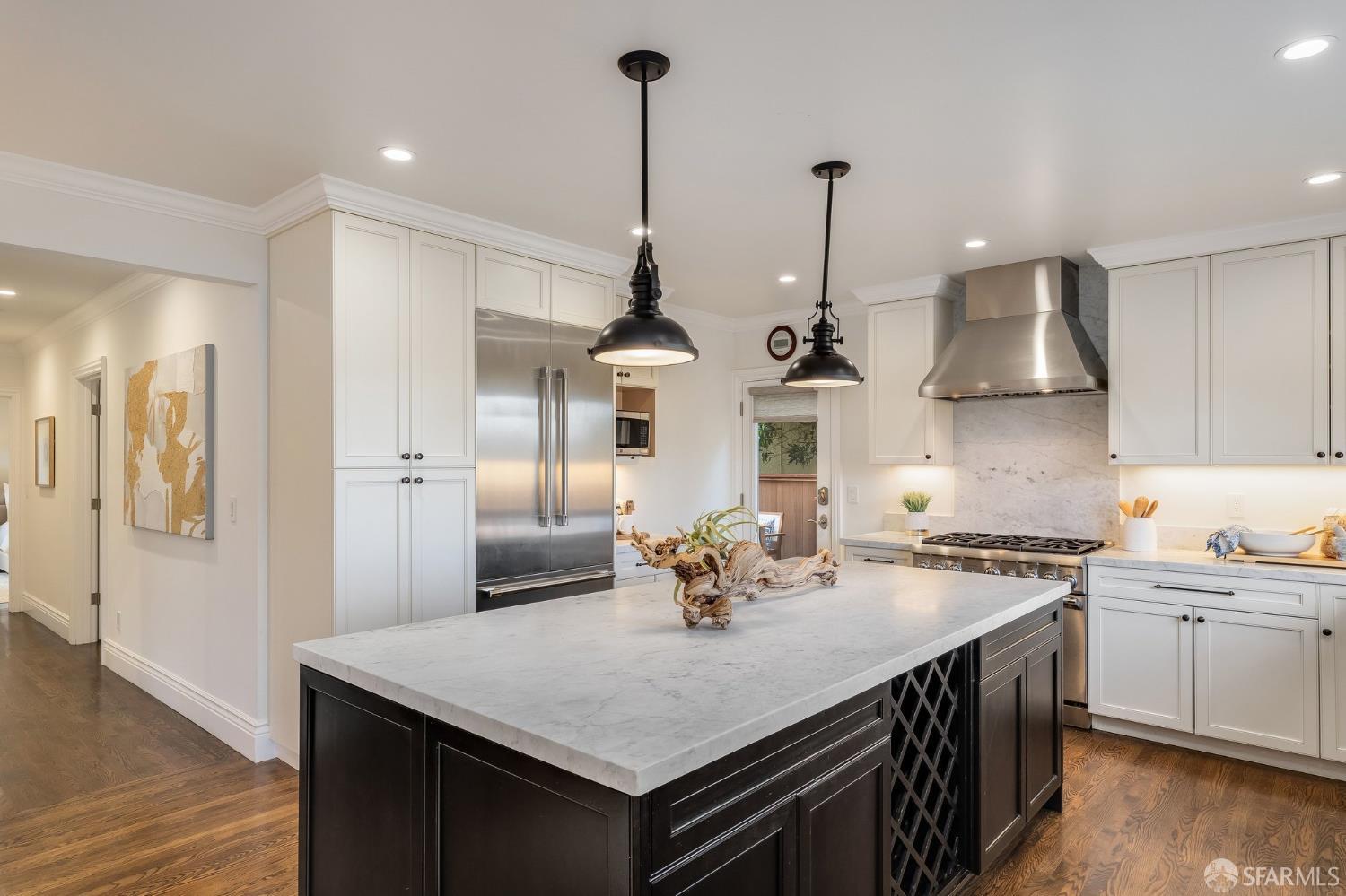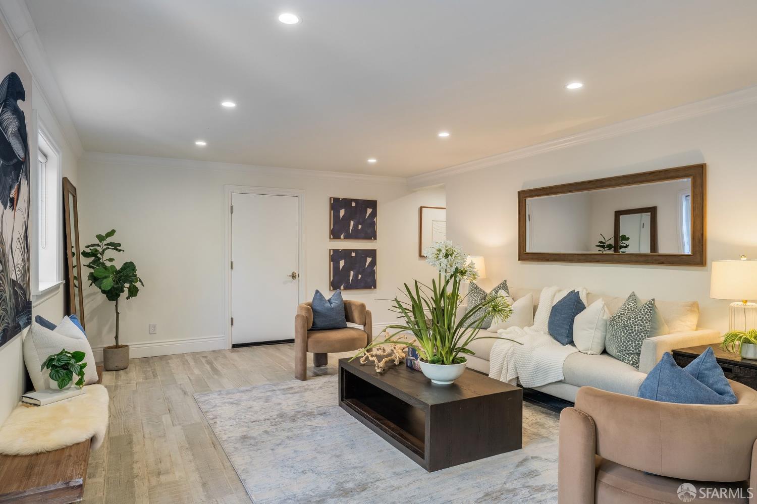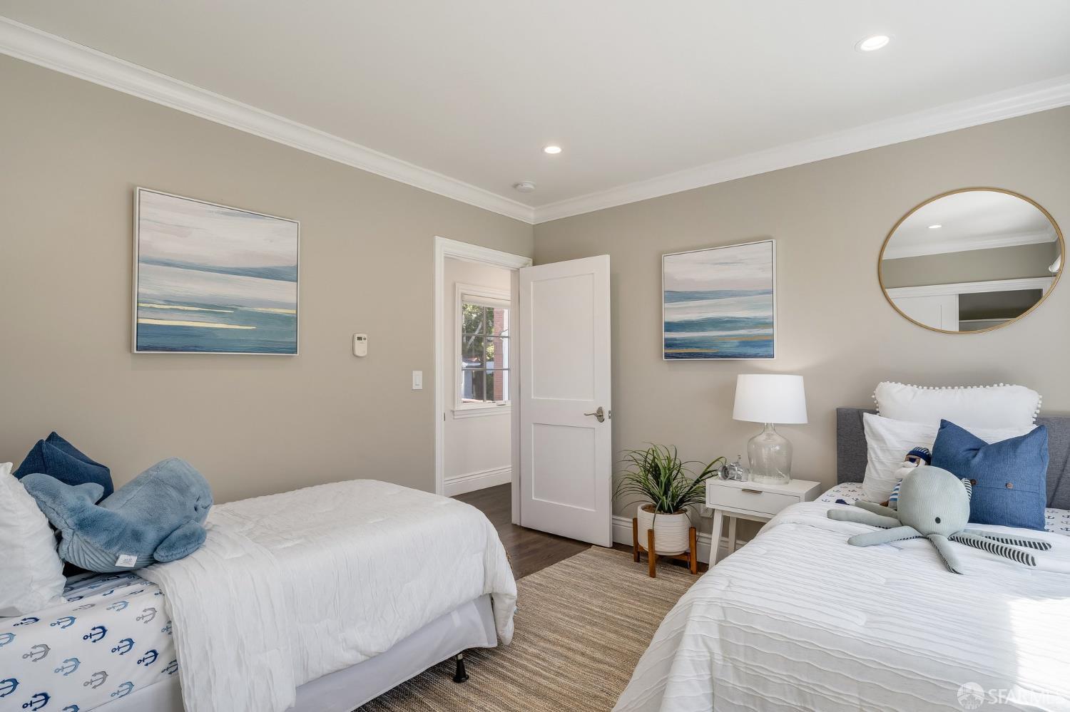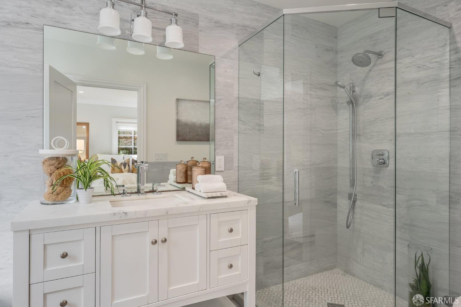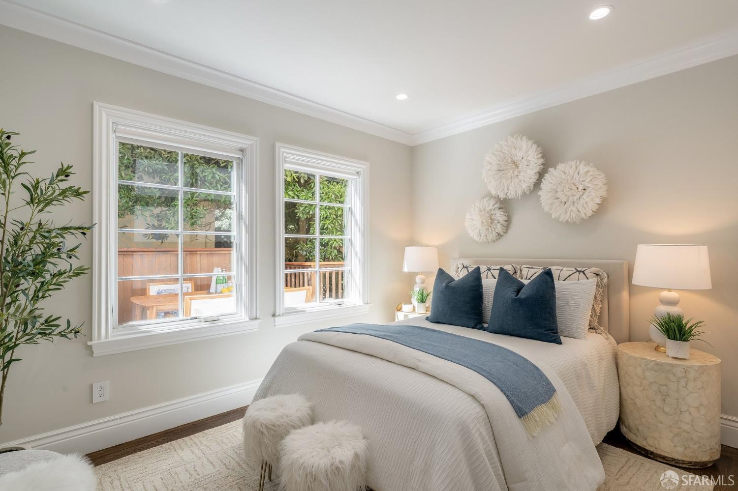 Located on a picturesque street, this beautifully remodeled and generously scaled five-bedroom, four-bath residence, with a family room and separate office, offers a flexible floor plan and timeless appeal in the sought-after Ingleside Terraces neighborhood. A formal entry sets the tone, leading to a spacious, light-filled living room with a custom gas fireplace and an abundance of windows. Adjacent is a large and inviting dining room. Seamlessly connected, the remodeled kitchen serves as a true centerpiece, showcasing Italian imported Carrara marble countertops, a large center island, and stainless steel appliances, with direct access to a deck, perfect for indoor-outdoor living and gatherings. The main level includes two well-proportioned bedrooms, including a generous primary suite, a full bath, an office or study, and laundry. Upstairs, two additional bedrooms and a full bath provide excellent privacy. The lower level features a very large family room with direct access to a lovely and spacious backyard patio, along with an additional bedroom, full bath, and ample storage. This level also offers direct access to the one-car garage, plus two-car side-by-side parking in the driveway. Throughout most of the home, hardwood floors are complemented by custom tile work in the bathrooms and lower level. Custom window coverings from The Shade Store and radiant heating throughout enhance comfort. The home's attractive curb appeal and mature landscaping, thoughtful layout, and high-quality remodel offer a rare combination of style, functionality, and warmth in one of San Francisco's most desirable neighborhoods. Minutes from transportation, Stonestown Galleria, shops and restaurants of West Portal.