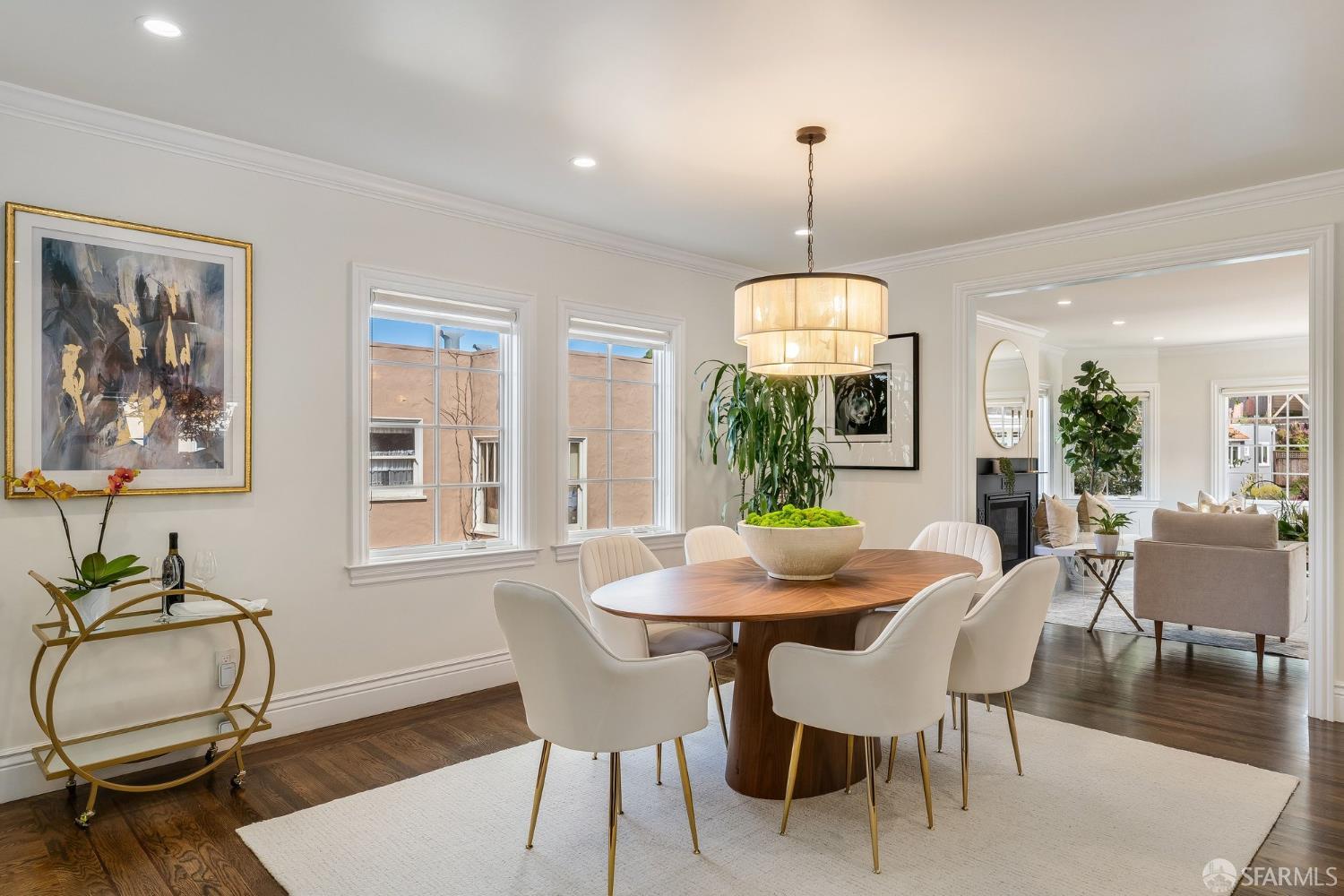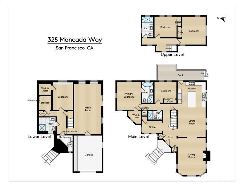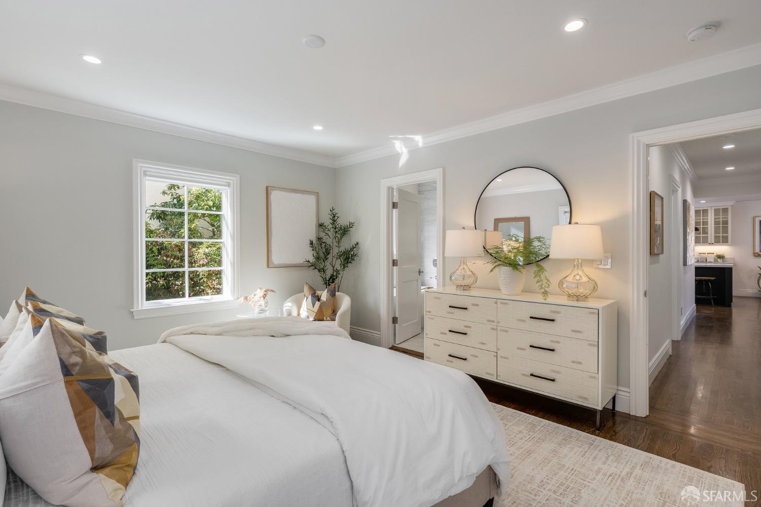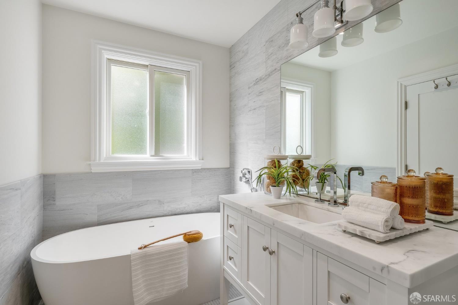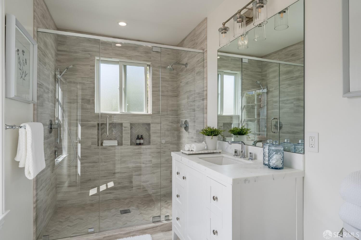 Located on a picturesque street, this beautifully remodeled and generously scaled five-bedroom, four-bath residence, with a family room and separate office, offers a flexible floor plan and timeless appeal in the sought-after Ingleside Terraces neighborhood. A formal entry sets the tone, leading to a spacious, light-filled living room with a custom gas fireplace and an abundance of windows. Adjacent is a large and inviting dining room. Seamlessly connected, the remodeled kitchen serves as a true centerpiece, showcasing Italian imported Carrara marble countertops, a large center island, and stainless steel appliances, with direct access to a deck, perfect for indoor-outdoor living and gatherings. The main level includes two well-proportioned bedrooms, including a generous primary suite, a full bath, an office or study, and laundry. Upstairs, two additional bedrooms and a full bath provide excellent privacy. The lower level features a very large family room with direct access to a lovely and spacious backyard patio, along with an additional bedroom, full bath, and ample storage. This level also offers direct access to the one-car garage, plus two-car side-by-side parking in the driveway. Throughout most of the home, hardwood floors are complemented by custom tile work in the bathrooms and lower level. Custom window coverings from The Shade Store and radiant heating throughout enhance comfort. The home's attractive curb appeal and mature landscaping, thoughtful layout, and high-quality remodel offer a rare combination of style, functionality, and warmth in one of San Francisco's most desirable neighborhoods. Minutes from transportation, Stonestown Galleria, shops and restaurants of West Portal.