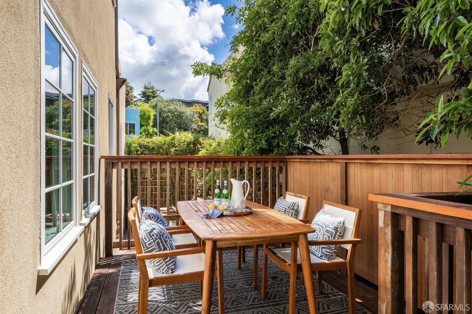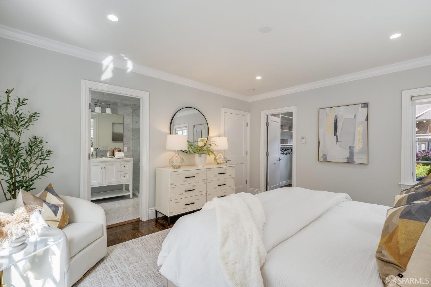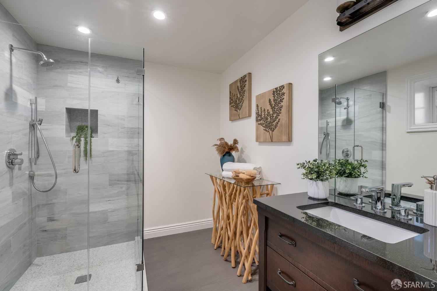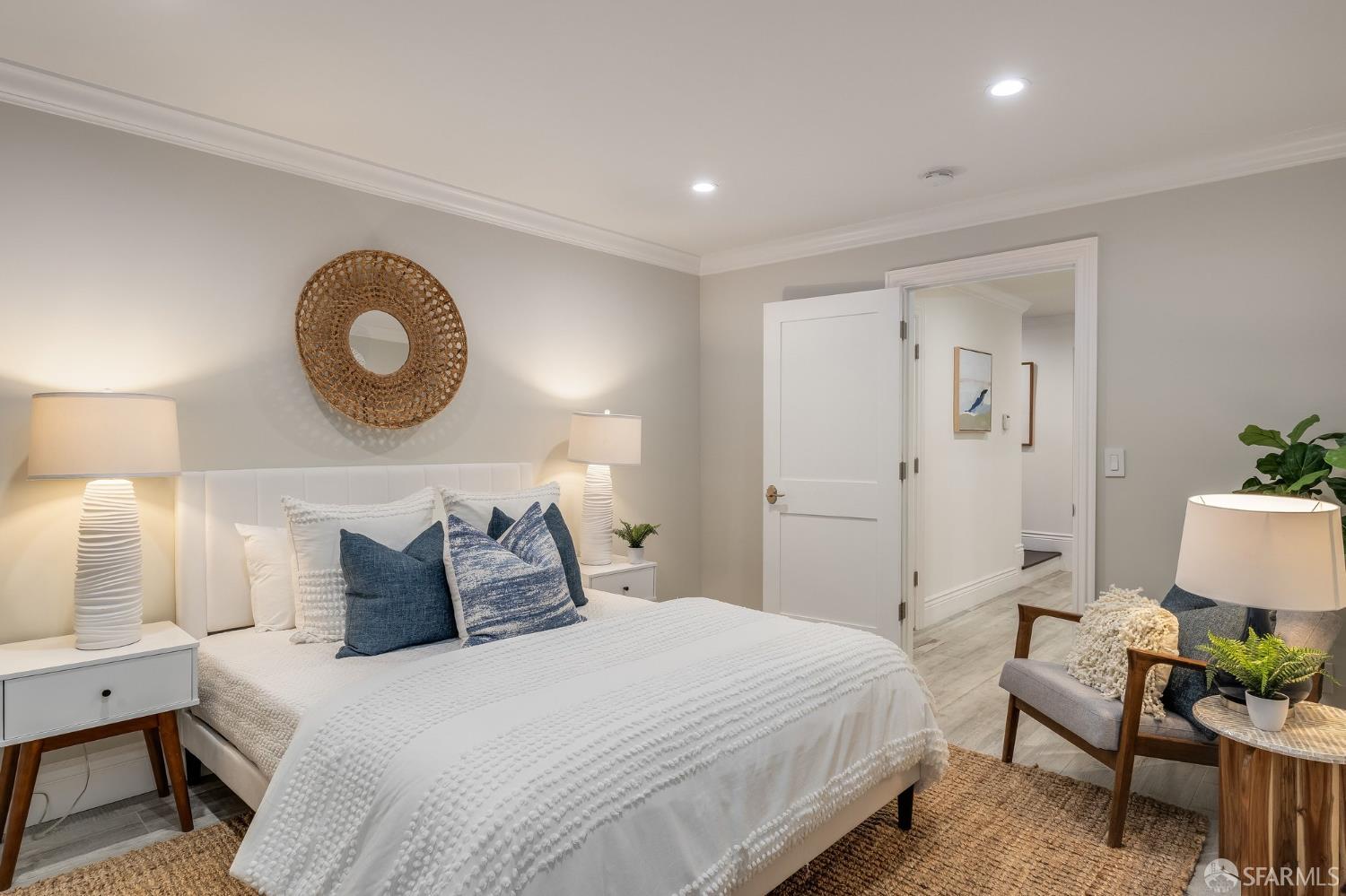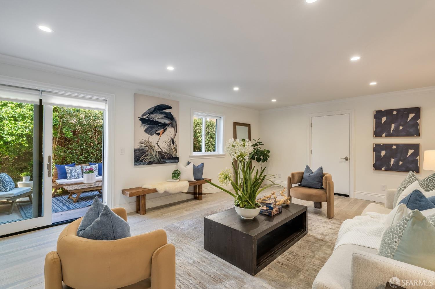 Located on a picturesque street, this beautifully remodeled and generously scaled five-bedroom, four-bath residence, with a family room and separate office, offers a flexible floor plan and timeless appeal in the sought-after Ingleside Terraces neighborhood. A formal entry sets the tone, leading to a spacious, light-filled living room with a custom gas fireplace and an abundance of windows. Adjacent is a large and inviting dining room. Seamlessly connected, the remodeled kitchen serves as a true centerpiece, showcasing Italian imported Carrara marble countertops, a large center island, and stainless steel appliances, with direct access to a deck, perfect for indoor-outdoor living and gatherings. The main level includes two well-proportioned bedrooms, including a generous primary suite, a full bath, an office or study, and laundry. Upstairs, two additional bedrooms and a full bath provide excellent privacy. The lower level features a very large family room with direct access to a lovely and spacious backyard patio, along with an additional bedroom, full bath, and ample storage. This level also offers direct access to the one-car garage, plus two-car side-by-side parking in the driveway. Throughout most of the home, hardwood floors are complemented by custom tile work in the bathrooms and lower level. Custom window coverings from The Shade Store and radiant heating throughout enhance comfort. The home's attractive curb appeal and mature landscaping, thoughtful layout, and high-quality remodel offer a rare combination of style, functionality, and warmth in one of San Francisco's most desirable neighborhoods. Minutes from transportation, Stonestown Galleria, shops and restaurants of West Portal.