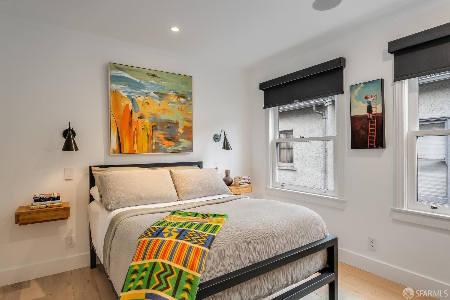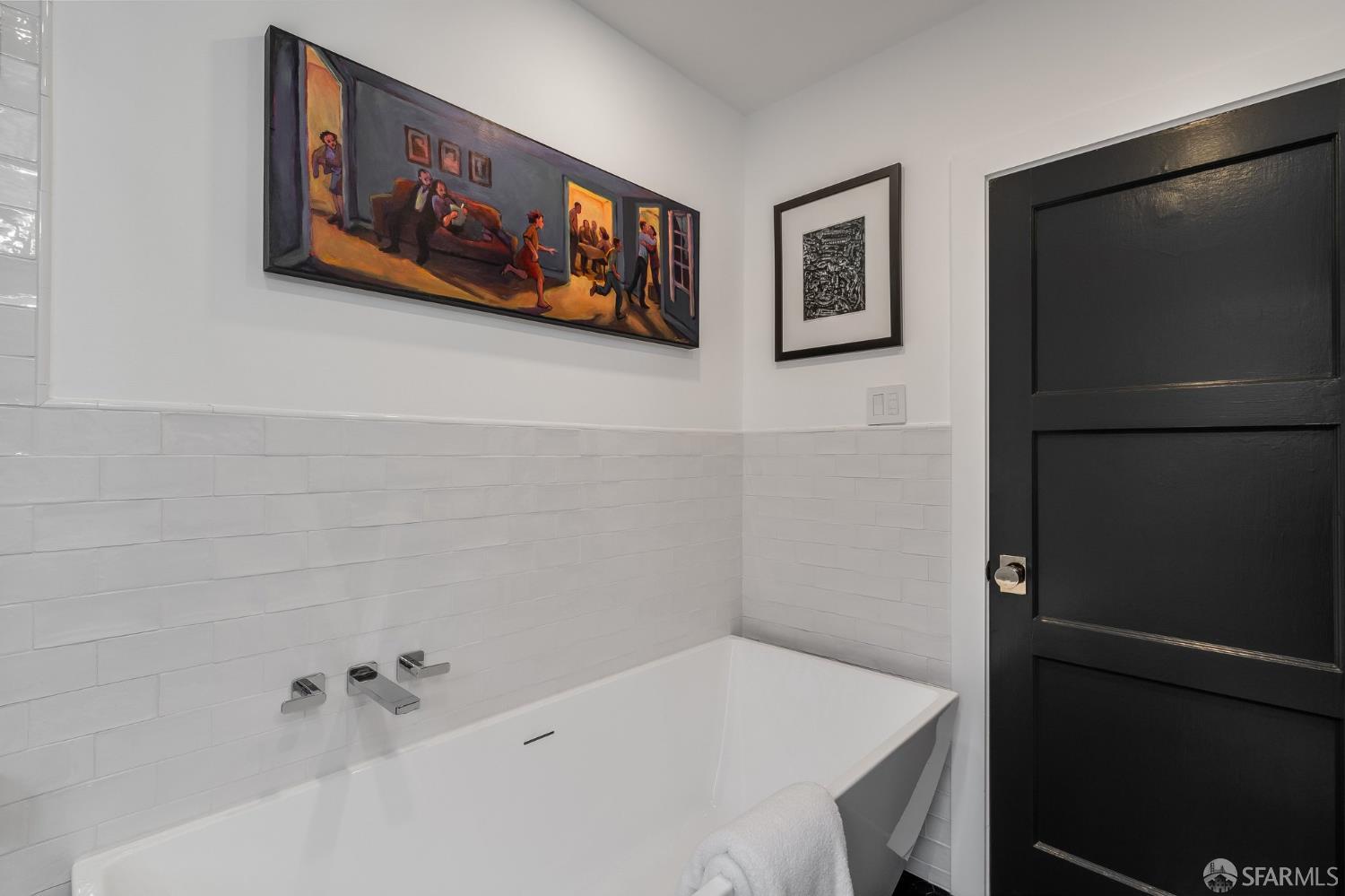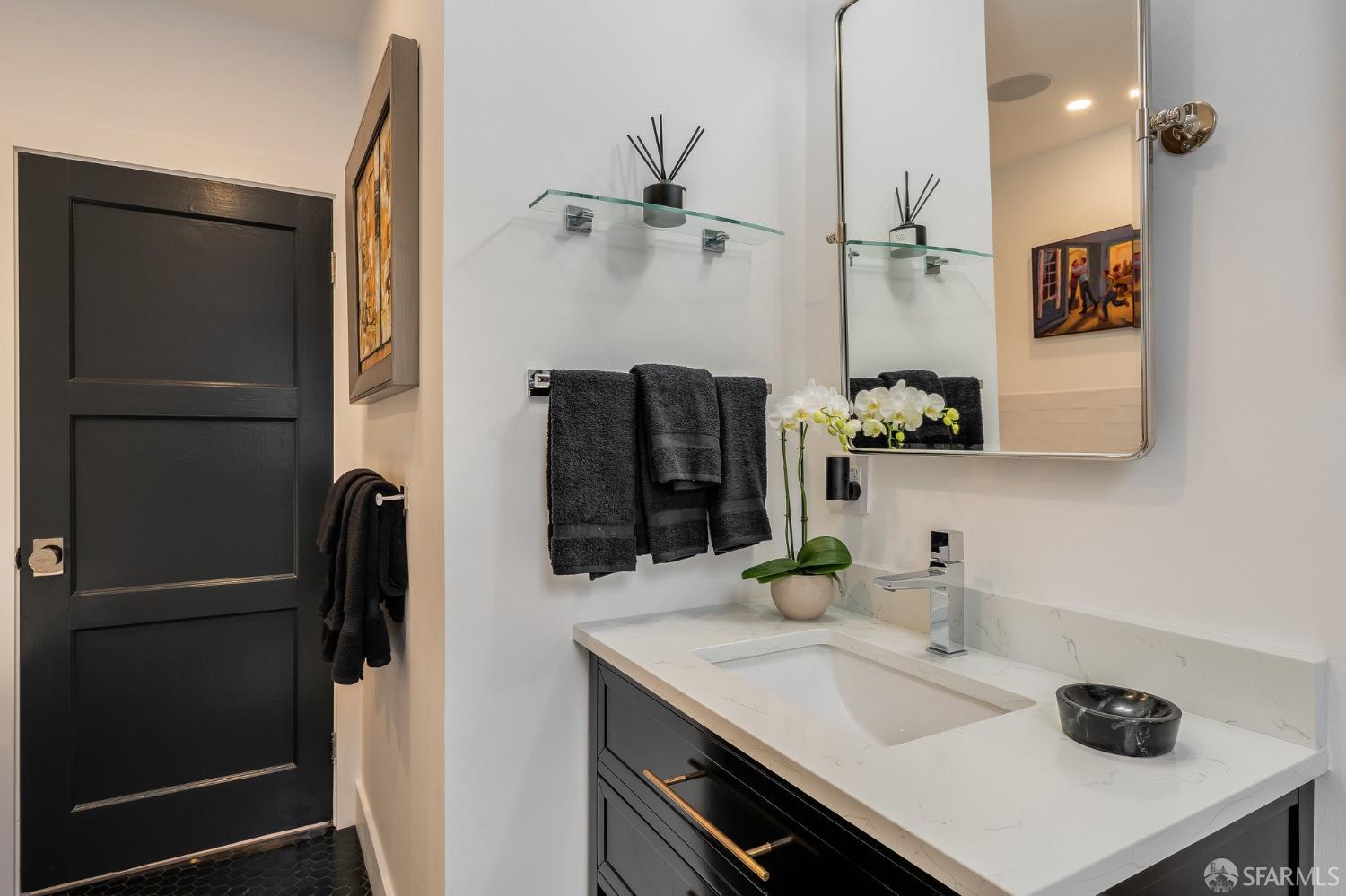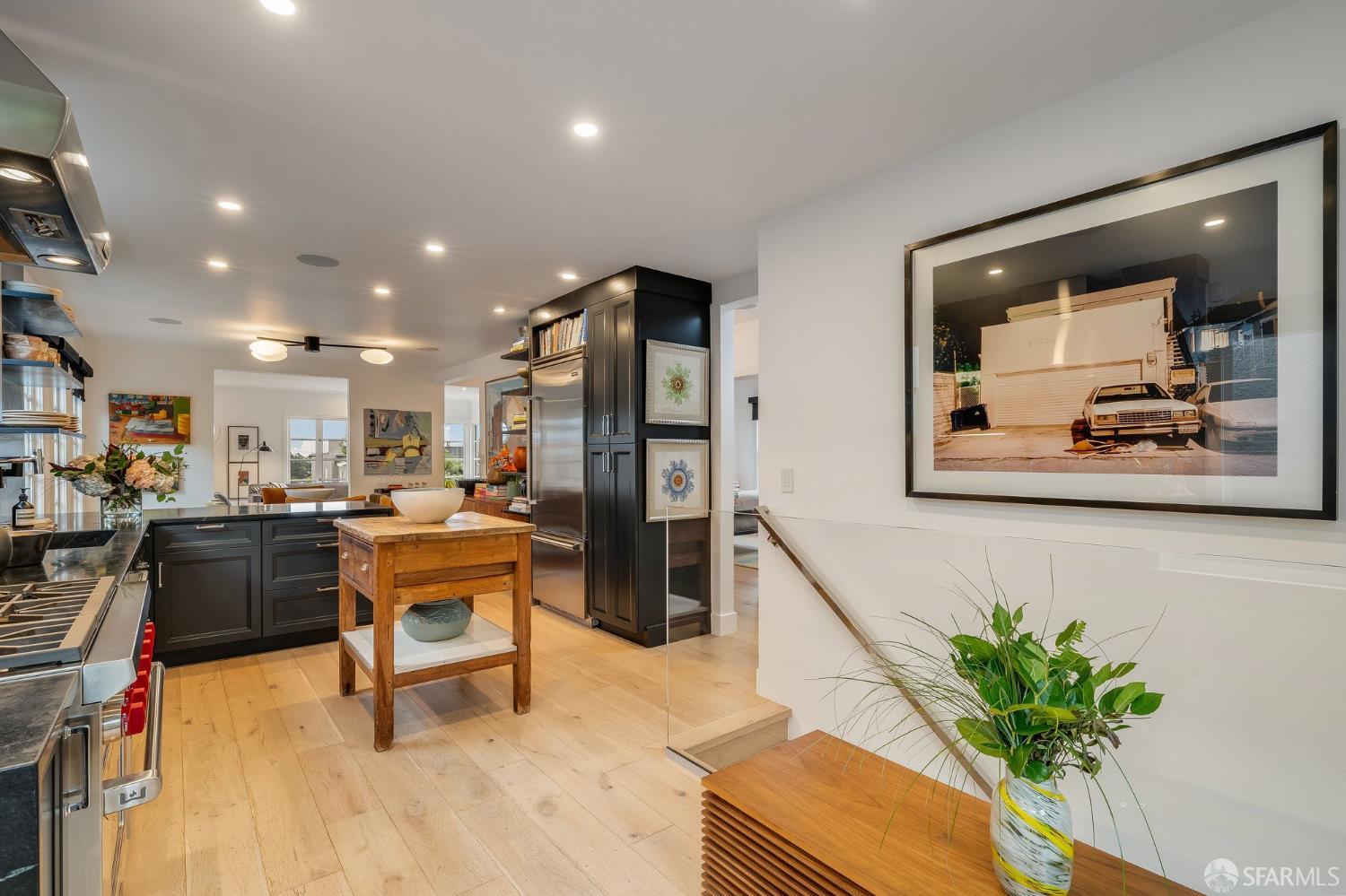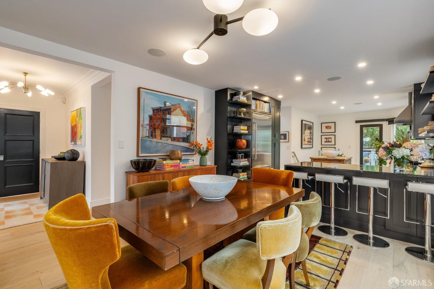 Absolutely stunning, detached, extensively remodeled residence offering refined design, high-end finishes, and seamless indoor-outdoor living. A welcoming foyer introduces the main level of this light-filled home. The expansive living room is anchored by a Heath-tiled wood-burning fireplace and framed by beautiful windows showcasing Twin Peaks views. The space flows effortlessly into the open dining area and chef's kitchen, creating an ideal layout for both everyday living and entertaining. The thoughtfully designed kitchen features a six-burner Wolf gas range with gas and convection oven, industrial-style Wolf hood, Fisher & Paykel two-drawer dishwasher, and Viking refrigerator. A dramatic full wall of soapstone, built-in shelving adds architectural character, while soapstone countertops with waterfall edges provide both beauty and function. A generous four-seat breakfast bar plus an additional dining area offer flexibility. Direct access leads to the large deck and beautifully landscaped, ultra-private yard, creating a seamless indoor-outdoor experience. Two spacious bedrooms are located on the main level. The rear bedroom offers direct access to the deck and garden, a large walk-in closet, blackout shades. A skylight brightens the hallway, enhancing the natural light throughout the level. The stylish full bath features a separate soaking tub and walk-in shower. A guest bath showcases a full wall of Heath tile. Both bathrooms are appointed with premium Toto heated, auto-flush toilets. A staircase off the kitchen leads to the permitted lower level, offering exceptional flexibility. This level includes direct back yard access, a private office with custom built-ins, and a spacious family room featuring a custom decorative wall of shelving, wet bar with Carrara marble countertops, wine refrigerator, and closet. A separate side entrance provides added versatility and potential for guest quarters, another bedroom, or future ADU. Also on this level is an additional bedroom with custom closets and automatic blackout blinds. The beautifully remodeled bathroom, accessible from both the bedroom and family room, features heated marble floors,dual sinks,Toto heated auto flush & walk-in shower. Two-car tandem garage provides direct interior access and includes custom built-in storage, washer and dryer.The backyard is a private oasis, thoughtfully landscaped with decomposed granite, natural gas fire pit, custom lighting and privacy. Minutes from shops, transportation.